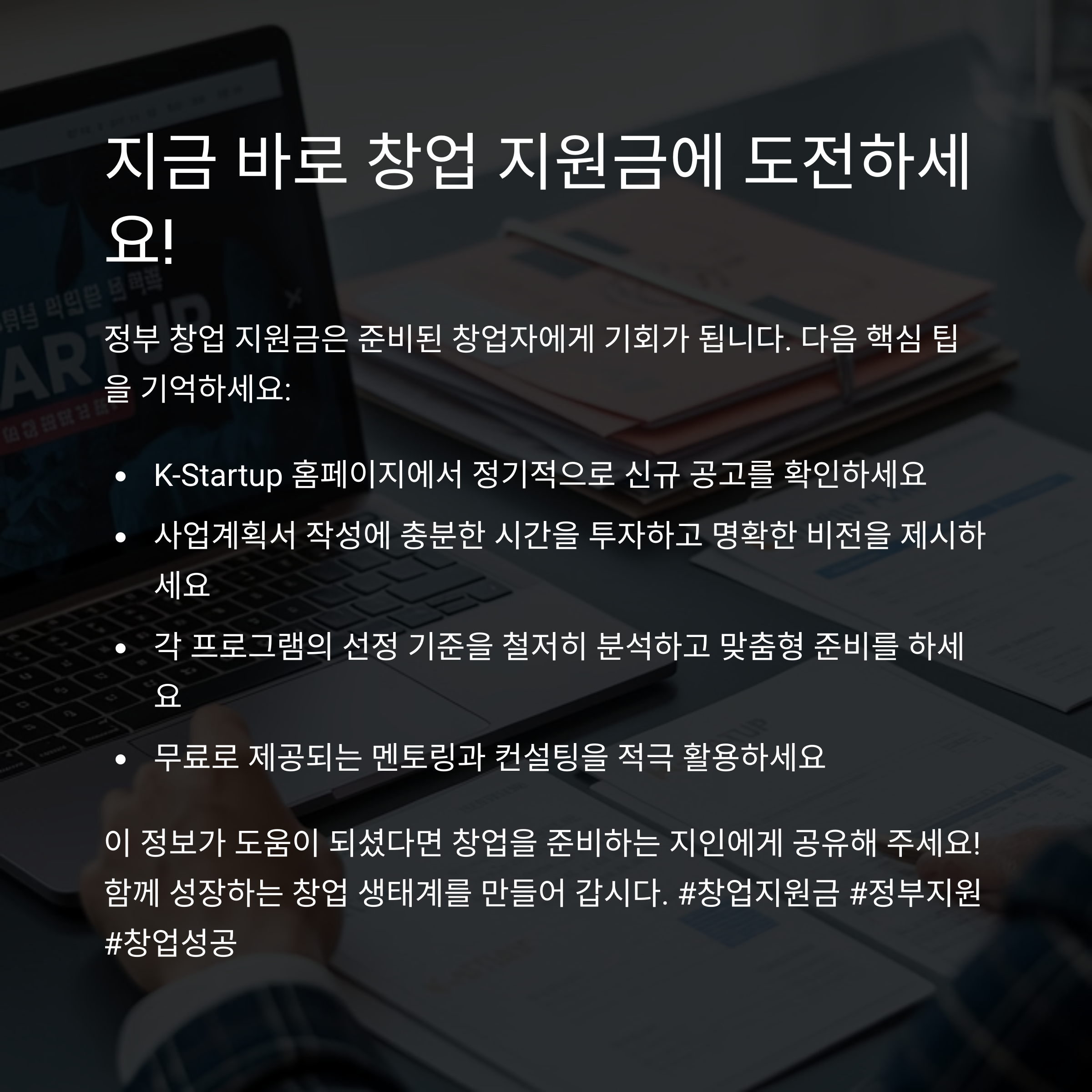 여러분, 혹시 정부에서 제공하는 다양한 창업 지원금을 제대로 활용하지 못하고 있진 않으신가요? 창업의 기회를 놓치지 않도록 제대로 준비해보세요!